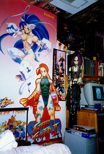 stand up 69k (407x600) This is by far my favorite thing in the whole world! I picked this up when I was in Japan a few years ago (from the Kansai Int'l Airport Capcom Arcade). By the way... if you think my web page is packed with lots of stuff, check out what the corner of my room with Cammy looked like when I was in college! The whole room looked just like that! Also, check out the Felicia poster... cool, huh? I've also got a Morrigan and Bulleta poster like that, but you can't see 'em here.. |